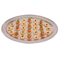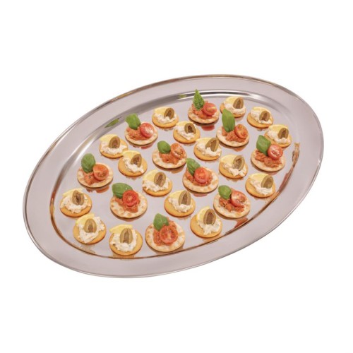 Voor servies dat zowel praktisch als stijlvol is, kies je een ovalen dienblad van Olympia van roestvrij staal. Dankzij het ontwerp van gepolijst roestvrij staal heeft dit ovale dienblad een elegante, opvallende look die de presentatie van uw hapjes, hors d'œuvres en drankjes zeker tot leven zal brengen. Een opstaande rand zorgt ervoor dat uw eten en drinken niet van het dienblad valt - waardoor het risico op kostbare, gevaarlijke morsen wordt geminimaliseerd. En vanwege het lichtgewicht materiaal is het voor het bedienend personeel gemakkelijk om dit dienblad te balanceren en te dragen. Dit betekent dat ze comfortabel en veilig grote hoeveelheden hapjes, desserts en dranken aan gasten kunnen serveren zonder bang te hoeven zijn voor druppels. Maar dat is niet alles. Het roestvrijstalen materiaal maakt het dienblad ook vaatwasmachinebestendig. Dus schoonmaken en onderhouden is zo eenvoudig als maar kan.
